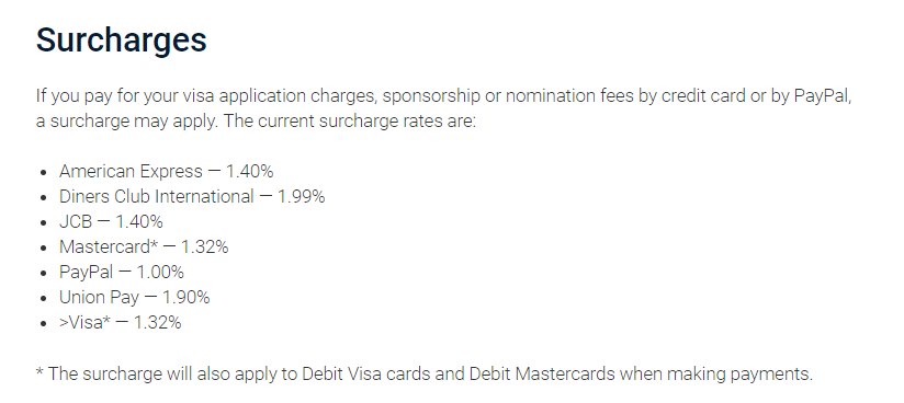 しかもオーストラリアビザはオンラインで申請をしておりますので海外で使えるカードのお支払いになります。なのでカード会社によってSurchargesがあります。